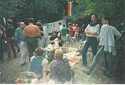 The first pink picnic was organised jointly by the ELTE gay action group, Homérosz Egyesület, Lambda Budapest Baráti Társaság, the editors of Mások, Miskolci Homeros, the Lesbian and Gay Jewish Group Leszbikus és Gay Zsidók Csoportja and VándorMások (the Roving Others), in the afternoon and evening of 13 September 1992. It was held at Hármashatár-hegy, which was a former quarry in the Újlak Mountain. It was initiated by the newspaper Mások or "Others" where it was advertised.[1] The newspaper later published an article about the event. The location was chosen with the help of Gosztony Zsigmond, the main tour guide of VándorMások.