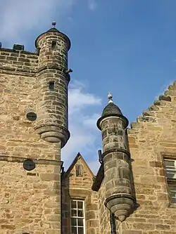 A Latin inscription above the door states that "Alexander Seton built this house not to the measure of his desire, but of his fortunes and estate".[8]