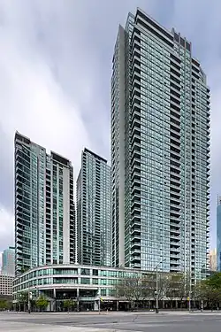 Pinnacle Centre is a condominium tower complex in Toronto, Ontario. The complex consists of four towers located on former railway lands on the Toronto waterfront. It is one of a number of new condominium projects in the area, the most notable being nearby Maple Leaf Square and CityPlace developments to the west. The Pinnacle Centre site is bounded by Yonge Street to the east, Harbour Street to the south, Bay Street to the west, and the Gardiner Expressway to the north. It was built by Vancouver−based Pinnacle International. It has 1,880 residences on approximately 3.8 acres of land.