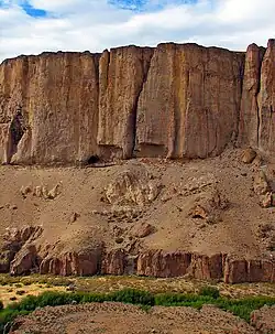 The canyon is made of ignimbrite,[1] among other volcanic rocks formed during the Jurassic period.[2] It was created through the erosion caused by the Pinturas River, which cut into the Chon Aike Formation to form the canyon.[2]