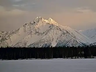 Pioneer Peak (Ahtna: Tnel'aay; Dena'ina: Dnal'iy) is a 6,398-foot (1,950 m) mountain in the Chugach Mountains in the U.S. state of Alaska. Located beside the Knik River just nine miles (14 km) south of Palmer and about six miles outside the Municipality of Anchorage limits, it is a prominent landmark in the Matanuska-Susitna Valley, as well as a popular hiking destination. Its Ahtna name means "the object is standing still" and its Dena'ina name means "the one that watches us".[3] The name was given in 1939 in honor of the pioneers of the Matanuska agricultural colony of the mid-1930s.[2] The Pioneer Ridge Trail leads up the eastern shoulder, beginning below 200', it allows access to the South summit. The North summit, and true summit of Pioneer Peak does not have a trail, and advanced mountaineering techniques are required. The first ascent of this peak was made June 1936 by Vernon Haik and John Wolffe via the Northwest Face.[4]