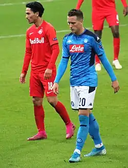 On 4 August 2016, after months of transfer speculation, Zieliński moved from Udinese to Napoli for a reported €16 million.[27] On 21 August 2016, he made his debut appearance for Napoli, alongside his compatriot Arkadiusz Milik, substituting Marek Hamšík in the 71st minute of the match against Pescara, which ultimately concluded in a 2–2 draw.[28] On 10 September 2016, he debuted in Napoli's starting lineup and provided an assist to José Callejón's goal against Palermo in Napoli's 3–0 victory.[29] On 13 September 2016, Zieliński made his Champions League debut in Napoli's match against Dynamo Kyiv, which concluded in his team's 2–1 victory.[30] He became the 57th Polish player to participate in Champions League representing a foreign club.[30] On 7 January 2017, his performance in the match against Sampdoria (2–1) marked his 100th match played in Serie A.[31] On 14 May 2017, he netted the final goal in Napoli's decisive 5–0 away win against Torino.[32] He scored his first goal with Partenopei's shirt on 3 December, in a 3–0 home win against Inter Milan;[33] he ended his first season with six goals and six assists in 47 mataches.