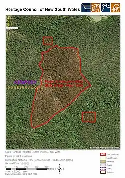 - ^ a b c d e f g h i j k l m n o p q r s t u v w x y z aa ab ac ad ae af ag ah ai aj ak al am an ao ap aq ar as at au av aw "Pipers Creek Lime Kilns". New South Wales State Heritage Register. Department of Planning & Environment. H01856. Retrieved 2 June 2018.