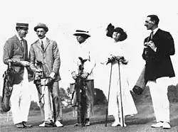 British polo players and their spouses playing golf at the Piping Rock Golf Links while visiting the US. From left to right: Captain Vivian Lockett, Captain H. A. Tomkinson, Mrs. Frederick W. Barrett, Lady Alice Grosvenor Wimborne (wife of Ivor Guest, Lord Wimborne), and Captain Leslie Cheape