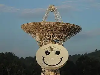 The principal radio research instruments at PARI are two 26-meter radio telescopes—referred to as 26-West and 26-East—and a 4.6-meter radio telescope named Smiley. These instruments are adapted for precision tracking of celestial radio sources using multiple frequencies. Smiley is used for remote classroom teaching of astronomy by students in the US and worldwide. According to PARI myth and legend, Smiley was given its pleasant face around 1982 as a greeting to overflying foreign surveillance satellites—particularly those belonging to the Soviet Union.[6]