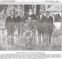 Other secular writers questioned Yoakum's faith healing practices. As early as 1903, Yoakum claimed his movement had performed some 800 healings, and the Los Angeles Times described Yoakum as the "leading apostle of the 'faith-healing' movement in this city."[11] However, the Times noted discrepancies in the dates and circumstances of the "healings" under the headline "Pouring Oil on the Sick ... Stories Don't Jibe."[11] In 1909, the Los Angeles Times published a lengthy article criticizing Yoakum's tactics. The article, titled "No Miracles Without Cash: Services Halt While Money Is Collected," described events at one of the healing services held at Pisgah Home.[20] The Times opened by quoting the Pisgah Home motto: "God loves a cheerful giver."[20] It then described a "Healing and Testimony of the Healed" service: