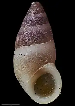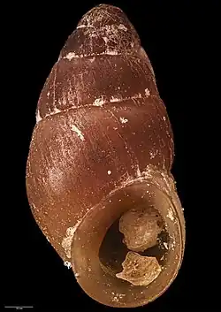 Shell small, ovate, solid. Whorls 4¾, including low dome-shaped protoconch of 1¾ whorls, which is faintly sculptured with closely spaced spiral striae. The surface of the post-nuclear whorls is smooth, but not polished, and apart from faint, slightly oblique axial growth lines, there is no true sculpture. Spire elevated, bluntly conical, one and a-half times height of aperture. Colour reddish-brown, except for a narrow whitish band immediately below the suture, and the peristome and interior of the aperture, which is more yellowish than reddish-brown. Aperture very large, almost circular. Peristome continuous, much thickened within and clearly marked off from the base by a heavy callus. There is no umbilical chink.[2]
