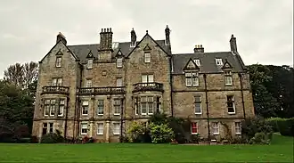 The house was sold to Archibald Primrose, 1st Earl of Rosebery, in 1703, and then to Sir Robert Blackwood, Lord Dean of Guild, and later Lord Provost, of Edinburgh, in 1711.[2] It remained in the Blackwood family for 170 years, but was unoccupied for almost a century. The castle was bought by Henry Beveridge, a wealthy mill owner, in 1884, when it was extended and modernised. He commissioned the architect Charles Kinnear in 1885 to add an east wing, insert larger windows on the ground floor, and add a portico to the north, leading to a new main entrance. The additions were detailed in a similar Scottish Renaissance style.[1] The grounds were also renovated, with a water garden and a narrow-gauge railway. Two entrance lodges were also built; the East Lodge survives, but the western one was demolished.[5]