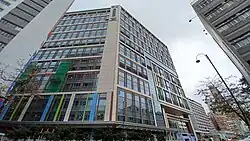 In 1929, a telephone exchange and staff quarters was completed on Kowloon Inland Lot 754 on Nathan Road, spanning between Waterloo Road and Pitt Street.[43] It was known as the Kowloon Telephone Exchange of the Hong Kong Telephone. This building was demolished on or before 1963, replaced by a commercial and residential building, Bell House, which named after Alexander Graham Bell, the inventor of telephone. The building is 200 feet high, with twenty-storey in six block.[47][48]