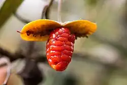 The fruit is a globose woody capsule,[3] it is covered in fine white hairs, and varies in colour from orange to brown as it matures. The mature capsule splits in half to expose rows of 8-20 red or orange sticky seeds.[3][4][5] Conspicuous dark valves can be seen on the inner face of the mature, open, capsule.[3]