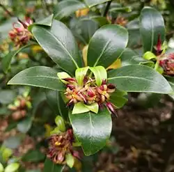 Pittosporum cornifolium, known as tāwhiri karo in Māori, is a species of plant in the Pittosporaceae family.[1] It is an epiphytic plant endemic to the North Island and the Marlborough Sounds of the South Island, New Zealand. In the wild it is considered rare and threatened, although it occurs more frequently on offshore islands in the north-east, along with P. kirkii, the only other epiphytic member of the genus. Also grows well as a ground plant and is a popular garden ornamental with two recognised cultivars.[2]