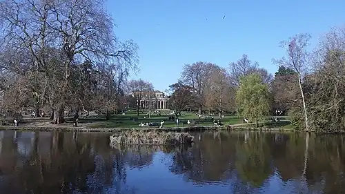 Pittville Park was created in the second decade of the 19th century[5] by Joseph Pitt as an area of 'walks and rides' for visitors of the Pittville Pump Room, together with many fine and imposing houses as part of the Pittville Estate development, for the rich and famous who came to live in Cheltenham. Pittville Park provides 33ha (82 acres) of parkland, including an ornamental lake with elegant bridges dating from 1827 and a boating lake, formerly known as Capper's Fish Pond. It was named after Robert Capper, owner of Marle Hill House, the grounds of which now constitute the western part of the Pittville Park. The lakes were created by damming a stream known as Wyman's Brook.