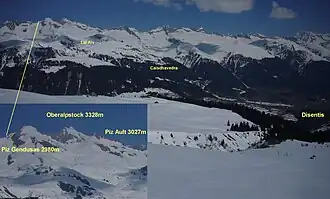 ![]() Piz Ault in the left part of the picture. A ski lift reaches to some 200 m (660 ft) under the peak, the lifts starting at Disentis. In April at date of the picture the winter season would be finished already. | |