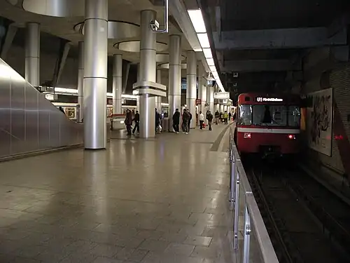 Plärrer station is the only Nuremberg U-Bahn station apart from Nürnberg Hauptbahnhof to have an interchange with all the U-Bahn lines – the U1, U2, and U3. Like Aufseßplatz, Hauptbahnhof and Friedrich Ebert Platz orange tiles indicate its intended use as an interchange station between different subway main lines. The station is named after the Plärrer, long an important interchange of various types of transportation including the site of the Nuremberg terminus for the Bavarian Ludwig Railway. Despite folk etymology linking the name to the local word "plärren" for screaming, it likely derives from Plarre a now disused word for a square.