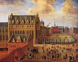 The palace burned down on the night of 3 February 1731 in a fire that took much of the original royal complex.[3][8] Funds were not available for rebuilding, so for more than forty years, it remained in a state of ruin, known as the Cour brûlée ("Burnt Court").[9] Several projects for the redevelopment of this space were proposed, including the reconstruction of a palace, which did not go beyond the stage of sketches, for lack of money.[10] The construction of a new palace also seemed to be all the less necessary since, in the meantime, the court had moved to the Palace of Orange-Nassau, on the site of today's Palace of Charles of Lorraine.[11] In 1769, the idea germinated to clear and level the ruins of the Place des Bailles and to convert it into an esplanade intended for military parades.[10] The plan was on the verge of completion in 1772, when another project rendered it obsolete.[3]