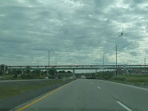 There is a park and ride lot located north of Regional Road 174 off Champlain street. This lot is accessible from the main station by a covered pedestrian overpass and is also serviced by Route 39 as it departs towards Blair via the Transitway. This parking lot reaches capacity on a daily basis, and, overflow parking is allowed at the south-west corner of the Place d'Orléans Shopping Centre. Trim station and the associated park and ride lot were constructed to alleviate pressure on the Orléans park and ride lot.