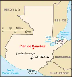 Plan de Sánchez is a small village in the municipality of Rabinal, Baja Verapaz department, Guatemala. On July 18, 1982, while General Efraín Ríos Montt was President of Guatemala, a massacre was committed there by government forces during which over 200 people were killed. The massacre was a part of what is known as the scorched earth policy where the Guatemalan army eliminated up to 200,000 Mayan and indigenous peoples in a 36-year civil war until 1996. In 2000 President Alfonso Portillo admitted that the government was responsible for the massacre in the village.