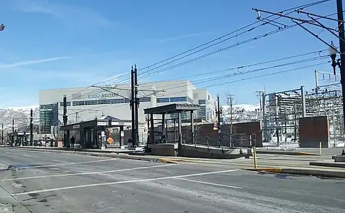 ![]() Planetarium station platform as seen from The Gateway looking towards Vivint Arena | ||||||||||||||||||