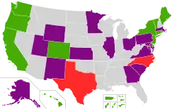 There is no national plastic bag fee or ban currently in effect in the United States. However, the states of California,[1] Colorado,[2] Connecticut,[3] Delaware,[4] Hawaii (de facto), Maine, New Jersey,[5] New York,[6] Oregon,[7] Rhode Island, Vermont[8] and Washington[9] and the territories of American Samoa, Guam, Northern Mariana Islands, United States Virgin Islands and Puerto Rico[10][11] have banned disposable bags. Over 200 counties and municipalities have enacted ordinances either imposing a fee on plastic bags or banning them outright, including all counties in Hawaii.[12]