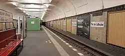 The station was designed by Alfred Grenander. For topographic reasons, it lies unusually deep underground and the station was therefore constructed with an unusually high vault and long platform.[1] Grenander made exceptionally expressive use of the play of light and shadow in the vaulting and its supports.[2] It is one of only 2 Berlin U-Bahn stations with no central columns, the other being Märkisches Museum.[3] It is tiled in grey with black accents.[1]