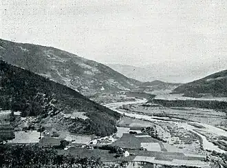 Plav and Gusinje are located in the Accursed Mountains range in the southern Dinaric Alps at an altitude of about 1,000m. They have a large Albanian and Muslim population. The regions were a target for expansion of Montenegro since its formation as the Principality of Montenegro. The area which then was part of the Ottoman Empire was to pass under Montenegro in 1879 but local resistance against the Montenegrin army by the Albanian League of Prizren in the Battle of Novšiće stopped its annexation. The area of the Vasojevići tribe is located to the north in Andrijevica and Berane. In the First Balkan War, the six battalions of Lower Vasojevići which formed a single brigade (Gornjovаsojevićkа brigаdа) with a total force of 3,200 were tasked with capturing the Plav-Gusinje region. It was first under the command of Rаdomir Vešović and in the beginning of the war passed under the command of Avro Cemović, a clan leader (serdar) from Vasojevići who was promoted to brigadier-general by King Nicholas I of Montenegro.[1] The brigade was part of the eastern detachment under general Janko Vukotić. When the war began, the Ottoman army - still in the aftermath of the Albanian revolt of 1912 - had deployed a very light regular force which was defeated and retreated very quickly when the Montenegrin attack began in the early hours between 8 and 9 October 1912. Effective resistance to the Montenegrin army was shown by local, volunteer sharpshooters. The Albanian households of Nokshiq/Novšiće, Arzhanica e Ultë/Lower Ržanica and Pepići/Pepaj, 127 in total, were burnt as the Montenegrin army advanced.[2]