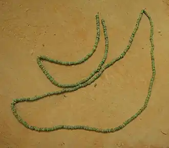 It was a high valued stone for jewels manufacturing, it was associated with water and the morning sky. Many pieces were found with various designs, among them are miniature figures (measuring about 3 mm or 1/8 of an inch), shaped as water droplets, lightning and dogs, animals associated with water.