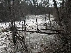 The outlet control structure at the south end of Little Sebago Lake failed on 4 June 1814, and within a few hours water draining to the Pleasant River eroded a channel through the moraine, dropping the lake elevation 50 feet (15 m). The resulting flood swept away two mills and six bridges along the Pleasant and Presumpscot rivers as far downstream as South Windham.[9] Drainage from Little Sebago Lake was permanently diverted from Outlet Brook into the Pleasant River by destruction of the moraine, although the lake level was partially restored by construction of a stone dam at the narrows in 1860. That dam failed with similar downstream damage on 7 May 1861, but has subsequently been rebuilt.[10]