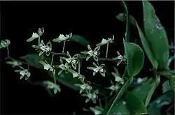 Plectorrhiza, commonly known as tangle orchids,[2] is a genus of three species of flowering plants from the orchid family, Orchidaceae and is endemic to Australia. Orchids in the genus Plectorrhiza are epiphytic or lithophytic herbs with short stems, long, tangled roots, short leathery leaves and small flowers on a short, thin flowering stem. Two species occur in eastern Australia and one is endemic to Lord Howe Island.