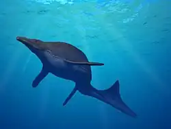 Plotosaurus possessed several adaptations to marine life not seen in other mosasaurs. Compared with their relatives, they had narrower flippers, large tail fins and a streamlined fusiform body shape.[9] This design converges with the morphology and hydrodynamic build of ichthyosaurs. Some of the tail vertebrae are fused together; unlike in most mosasaurs this is not a pathological condition but another aquatic adaptation that allowed Plotosaurus to achieve a more efficient swimming design. Altogether, Plotosaurus possessed the highest level of aquatic adaptations in any mosasaur.[10] These features probably enabled them to also be one of the fastest of the mosasaurs.[11] They also had relatively large eyes for keen eyesight, and impressions found with their fossils suggest that they had scaly skin.[9]