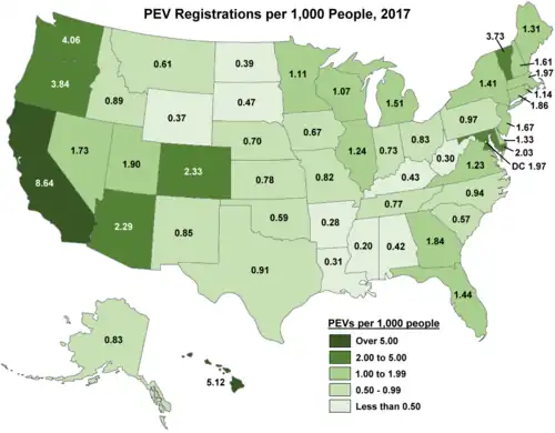 - ^ a b c d U.S. Department of Energy, Office of Energy Efficiency and Renewable Energy (EERE), Vehicle Technologies Office (10 December 2018). "Fact #1059: December 10, 2018 California had the most plug-in vehicle registrations per 1,000 people in 2017". Vehicle Technologies Office. Retrieved 26 January 2019.