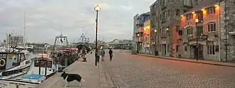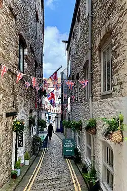 The Barbican is the name given to the western and northern sides of Sutton Harbour, the original harbour of Plymouth in Devon, England. It was one of the few parts of the city to escape most of the destruction of The Blitz during the Second World War and the preceding era of slum clearance following the Public Health Act 1848 (11 & 12 Vict. c. 63). Two or three streets still retain some of the architecture of a historic fishing port. The Barbican has the largest concentration of cobbled streets in Britain and contains 100 listed buildings.[1]