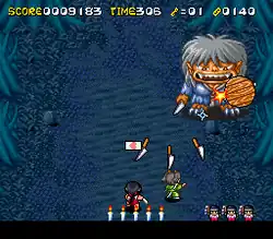 The game is played in a top-down view, featuring many elements from classic shoot 'em up games but giving the player free eight-directional movement. Player one controls the main protagonist, Pocky, who attacks by throwing ofuda talismans (referred to as "cards" in English versions). Pocky can pick up items to improve her attack power and new clothes to protect herself from damage, as well as throw player 2's character and use magic. Player 2 assumes a supporting role as one of Pocky's friends each possessing a unique attack and unlimited lives. If there is no second player, the supporting character will be CPU-controlled.