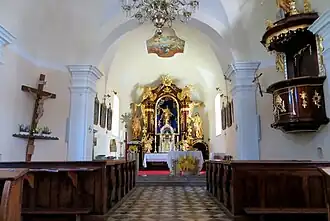 The picturesque fortified Tabor Church, in the hamlet of Podtabor on a rock above the motorway from Ljubljana to the Karawanks Tunnel, is a well-known landmark on the route. It was built some time soon after 1471 as a fortification where the locals could escape from Ottoman raids. The worst Ottoman incursions across Upper Carniola and into Carinthia were in 1476 and 1477. The building of the walls around the church was conditioned by the favourable natural position on an elevation in the middle of a plain, affording a view in all directions. The walls surrounding the church are irregularly shaped and were built on two levels with a roofed walkway, balistraria, and defense tower. The defence tower overlooked the only entrance over a drawbridge. On the western side the church was fortified with a moat and dike. This was also where valuables, food, and livestock were kept.[6] The church is dedicated to Saint Benedict and Our Lady of Sorrows.[7] One of the paintings in the church is by Ivana Kobilca, who lived in the village for a while.[8]
