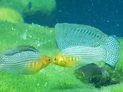 Poecilia velifera, known as the Yucatan molly and also as the giant sailfin molly amongst aquarists,[3] is a large livebearer that lives in coastal waters of the Yucatan Peninsula. These live-bearer (Poeciliidae) fish are particularly well known for both the extreme size variation among males, and the sexual dimorphism between males and females in both body shape and behavior.