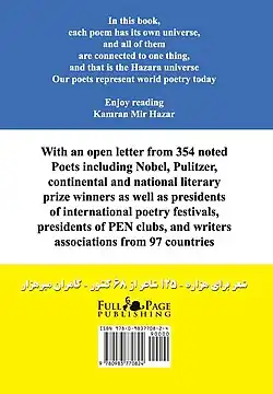 Poems for the Hazara is a multilingual poetry anthology and a collaborative poem composed of the works of one hundred twenty five internationally recognized poets from sixty-eight countries. Poems in this book are in English, Spanish, Catalan, Japanese, Norwegian, Turkish, Hazaragi, Italian, Greek, German, Irish, Hebrew, Romanian, French, Armenian, Hungarian and Portuguese.[1][2][3][4][5] All non-English poems have been translated into English. "Poems for the Hazara" includes the poetry anthology and a collaborative poem (Collaborative poetry) featuring contributions from 23 international poets. An open letter from 354 celebrated poets including Nobel, Pulitzer, continental and national literary prize winners as well as presidents of PEN clubs, and writers associations from 97 countries is included at the end.[6] This letter is addressed to world leaders in support of the Hazara people. The executive editor is Hazara poet, journalist and human rights activist, Kamran Mir Hazar.[7][8]