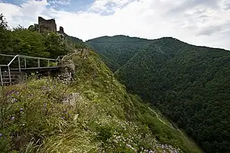 Poenari Castle (Romanian pronunciation: [po.eˈnarʲ]), also known as Poenari Citadel (Cetatea Poenari in Romanian), is a ruined castle in Romania which was a home of Vlad the Impaler.[2] The citadel is situated on top of a mountain and accessed by climbing 1,480 concrete stairs.
