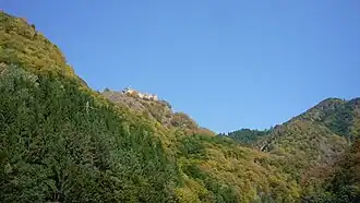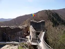 However, in 1459, realizing the potential for a castle perched high on a steep precipice of rock, Vlad III the Impaler repaired and consolidated the structure by arresting his enemies from the nobility from Wallachia,[6] making it one of his main fortresses, rebuilding the former Castle Arges on the left side of the river with stones from the older Castle Poenari, which was on the right bank and somewhat lower.[7][8] Although the castle was used for many years after Vlad's death in 1476, it eventually was abandoned again in the first half of the 16th century and was in ruins by the 17th century. The size and location of the castle made it difficult to conquer. On 13 January 1913, a landslide caused by an earthquake brought down parts of the castle which crashed into the river far below. After two further earthquakes in 1940 and 1977 that caused further damage, it was slightly repaired and the walls and its towers still stand today.[9][10] Since 2009, the site has been administered by the Argeș County Museum.[11]