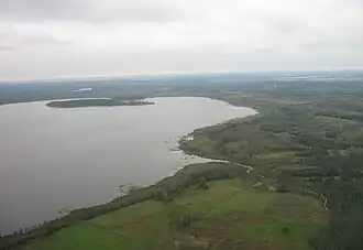 The lake is polymictic with a round shape and a depth which does not have substantial difference. The lake's area is 670.8 ha (1,658 acres), with a maximum depth of 2.6 metres (8 feet 6 inches).[1] In the Northern part of the lake is located the island Ostrów Wielki with an area of 21 ha (52 acres).[4] The lake is mainly surrounded by forests (about 95%, the rest 5% are fields and pastures). The shore of the lake is a swamp, and is not easily accessible. The surface of the lake is covered with vegetation from the water. The main inflow of the lake is the river Rybnica, which carries water from the lake Brzozolasek. The outflow of the lake is also by the river Rybnica in the South which flows the water to the nearby lake Pogubie Małe. From the Western side of the lake the river Zimna flows in.[2]