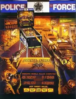 Police Force is a 1989 Williams pinball machine. The pinball machine was initially supposed to be released as Batman pinball, the police car was to be the Batmobile and the Jail was to be the Bat Cave.[1] The machine features anthropomorphic jungle animals in the roles of police and robbers.