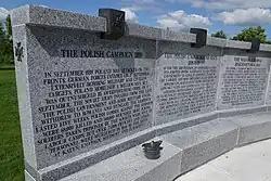 The Polish Forces War Memorial statue is set within an imposing 18-metre diameter architectural feature and has a series of plaques inset into the monument surround describing the Polish contribution in the Second World War so therefore the monument acts as a tribute to the fallen and to enable visitors to learn an overview of the history of the allied Polish Forces during World War II.[3]