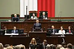 Polish Presidential Inauguration refers to the ceremonial proceedings that mark the commencement of a new term for the President of the Republic of Poland. In accordance with Article 130 of the Constitution of the Republic of Poland, the sole constitutional requirement for assuming the office is the taking of the presidential oath before the National Assembly.[1] All additional components of the inauguration are of a ceremonial nature.[2]