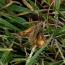 Both sexes have dark brown and yellowish-orange markings as adults. Ventrally, both sexes have a large straw-coloured patch in the middle of the hindwing. This patch helps distinguish it from other Polites.[2] Males are lighter than females, and they have a stigma (round or oval mark) on the forewing.[3] Like other skippers, the ends of the antennae have tiny hooks. The wingspan ranges from 19 to 27 mm.