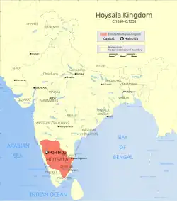 The Hoysalas had become a powerful force even during their rule from Belur in the 11th century as a feudatory of the Chalukyas (in the south Karnataka region).[104] In the early 12th century they successfully fought the Cholas in the south, convincingly defeating them in the battle of Talakad and moved their capital to nearby Halebidu.[105][106] Historians refer to the founders of the dynasty as natives of Malnad Karnataka, based on the numerous inscriptions calling them Maleparolganda or "Lord of the Male (hills) chiefs" (Malepas).[104][107][108][109][110][111] With the waning of the Western Chalukya power, the Hoysalas declared their independence in the late twelfth century.