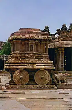 Many important monuments at Hampi were either completed or commissioned during the reign of Krishnadevaraya. The enduring legacy of this empire is the vast open-air theatre of monuments at the regal capital, Vijayanagara, which is now a UNESCO World Heritage site. Vijayanagara architecture is a vibrant blend of the preceding Chalukya, Hoysala, Pandya and Chola styles.[132] Literature in Telugu, Kannada, Tamil and Sanskrit languages found royal patronage. Telugu attained its height in popularity and reached its peak under Krishnadevaraya.[133] The Kannada Haridasa movement contributed greatly to Carnatic music and fostered a strong Hindu sentiment across South India.[134][135][136] With the defeat of the Vijayanagara Empire in the Battle of Talikota in 1565 by the Deccan sultanates, the Karnataka region and South India in general became fragmented and subsumed under the rule of various former feudatories of the empire. A diminished Vijayanagara Empire moved its capital to Penukonda in modern Andhra Pradesh and later to Chandragiri and Vellore before disintegrating. In the south and coastal Karnataka region, the Kingdom of Mysore and the Keladi Nayaka of Shimoga held sway while the northern regions were under the control of the Bijapur Sultanate.[137] The Nayaka kingdom lasted into the 18th century before merging with the Kingdom of Mysore which remained a princely state until Indian independence in 1947, though they came under the British Raj (rule) in 1799 following the defeat and death of the last independent Mysore king, Tipu Sultan.