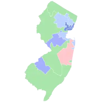 | 2010 | Chris Christie (R) | Kim Guadagno (R) | 23D, 17R | 47D, 33R | Bob Menendez (D)[ac] | Frank Lautenberg (D) | 8D, 5R | Barack Obama/ Joe Biden (D) |