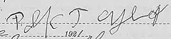 Polk Taylor was born 1833 in Brownsville, Tennessee.[4] His father was Tom Alexander, a native of Tennessee;[4][5] Polk Taylor's mother is recorded in his death certificate as "Phyllis," a native of Africa,[5] and on his second marriage documents she is listed as Phyllis Richard.[6] Polk Taylor was apparently manumitted sometime around 1858 and then studied for the Methodist ministry.[2] A Rev. Polk Taylor of Texas is listed in a directory of contributors to a Baptist missionary fund in 1887.[7] He lived for some time in Colorado, where he seemingly lived and preached in Calhan.[8] His wife and adult son both died in 1913 and services were held for them in Colorado Springs.[9] He moved to Washington state about 1915.[2] On December 30, 1921, at age 83, he remarried to a 42-year-old divorcée named Lizzie Smith Clay.[10] In Washington, he was called "Uncle," tended a vegetable garden at his home, and voted in every election.[11] He died June 18, 1934, of chronic myocarditis at the county home in Yakima, Washington, at age 100.[5][1][12]