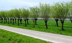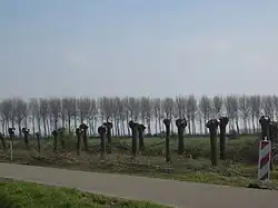 Pollarding is a pruning system involving the removal of the upper branches of a tree, which promotes the growth of a dense head of foliage and branches. In ancient Rome, Propertius mentioned pollarding during the 1st century BCE.[1] The practice has occurred commonly in Europe since medieval times, and takes place today in urban areas worldwide, primarily to maintain trees at a determined height or to place new shoots out of the reach of grazing animals.[2][3]