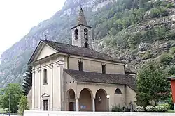 In the early centuries, there were two local centers: the mountain community of Saymola (Simbra, Symora) (probably the oldest of the two) and the other on the valley floor.[4] The small village was part of the Commune of Leventina (with villages in the valley) and over the Novena pass to the Moleno river.[5] The Leventina was given in 945 to the Canons of the Cathedral of Milan, who held it until 1403 when it passed into the hands of Uri.[5] The municipality was formed by ten Vicinie. Pollegio with Bodio and the mountain of Sobrio, were part of the Vicinanza of Giornico.[5] The location at the intersection of the Three Ambrosian Rite Valleys, led to the creation, between 1210 and 1236, of a hospice for travelers known as the "Hospitale de Santa Maria in Campo Canino de Pollezio de gli Humiliati", directed by the religious order of the Humiliati.[6] After 1326, the hospice was called a "monastery", under the direction of the Humiliati.[6] In 1422 the Confederates met in Pollegio to swear an oath before the Battle of Arbedo.[5] Moreover, from Pollegio, the Confederates sent a declaration of war to the Duke of Milan.[5] In 1478 after the Battle of Giornico of 28 December (which occurred in the territories between Bodio and Pollegio) the Confederates buried their dead in Pollegio. In the following years, they built an ossuary which was later replaced with a Church devoted to the Santissimi Martiri Innocenti (Most Holy Innocent Martyrs).[7] Until then, the only available church was the Church of St. Mary attached to the Humiliati hospice and monastery. The church was later transformed into a parish church (of the Ambrosian Rite and dedicated to the Innocent Martyrs).[6] 28 December, the date of battle, became the patron saint's day.[8] Later, the Confraternity (founded by San Carlo Borromeo as a Blessed Sacrament Confraternity and later erected to the glory of St. Anthony of Padua) added a new patron saint's day 13 June based on popular devotion to St. Anthony of Padua. The church, with a single nave and a barrel vault, was renovated in the Baroque style in the 18th century and further renovated in the 19th and mid-20th centuries.[8]