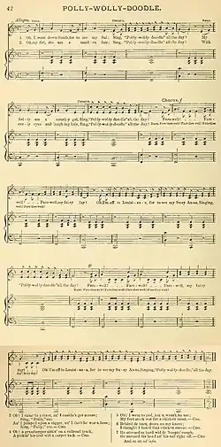 "Polly Wolly Doodle" is an American minstrel song that became a popular children's song. It was sung by Dan Emmett's Virginia Minstrels, who premiered the song at New York's Bowery Amphitheatre in February 1843,[1] and is often credited to Emmett (1815–1904).[2][3]