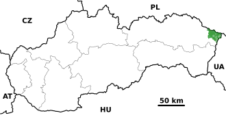 The park is located in the Snina District in the Prešov Region. It is adjacent to Bieszczady National Park in Poland; together they are part of the East Carpathian Biosphere Reserve. The highest point lies at 1,208 m (3,963 ft) AMSL on a point where the borders of Slovakia, Poland and Ukraine meet, near the summit of the mount Kremenec. The National Park is the easternmost and least populated area of the country. Hiking trails start from several villages, most notably Nová Sedlica but also from Runina, Topoľan and Uličské Krivé.